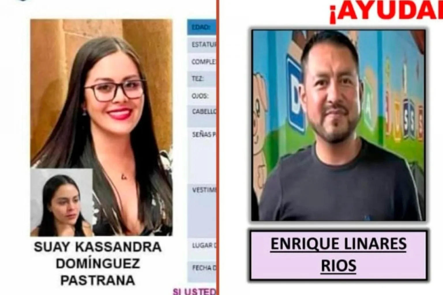 La Comisión Estatal de Búsqueda de Personas de Guerrero reportó en redes sociales la desaparición de Suay Kassandra Domínguez Pastrana, de 30 años y Enrique Linares Ríos, de 41 años, ambos agentes de la FGR.