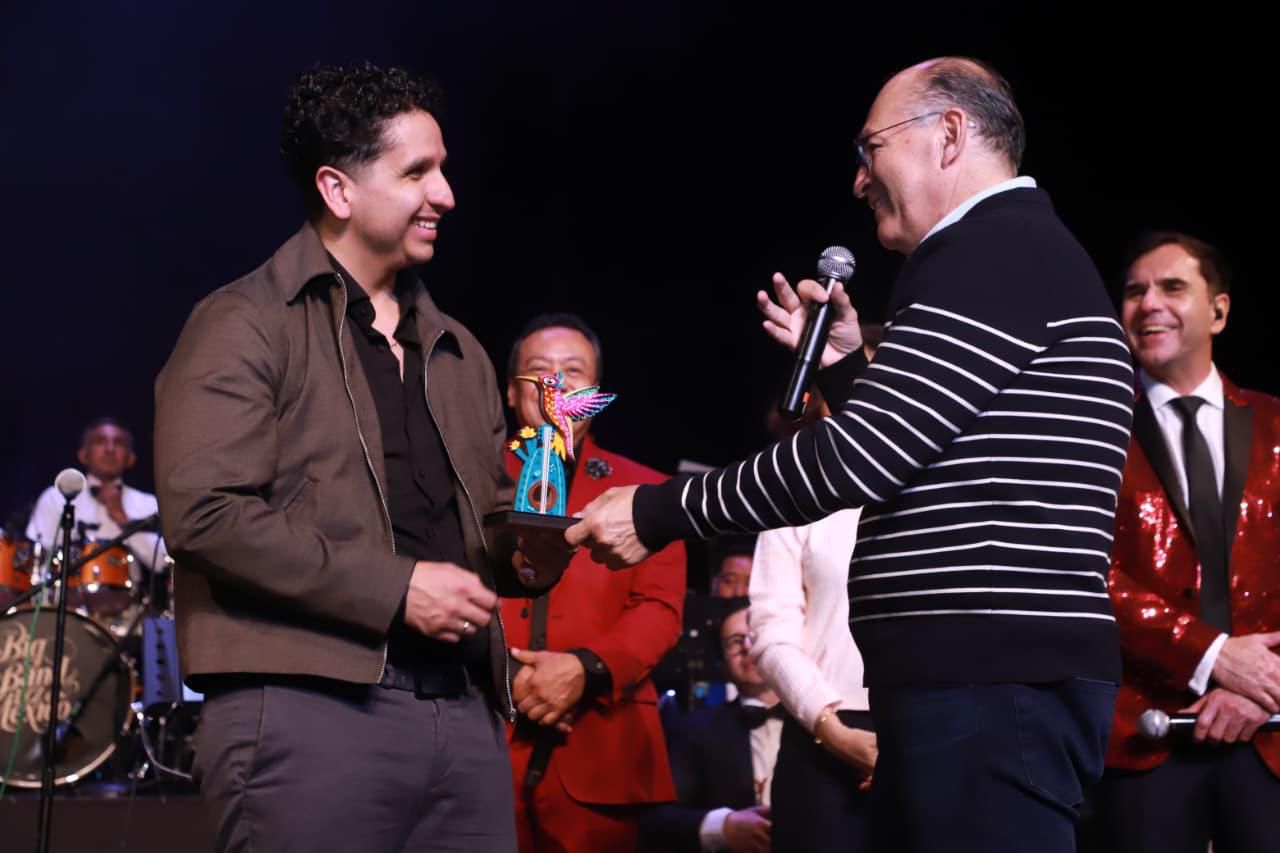 • El Alcalde Enrique Galindo encabezó el homenaje en el Teatro de la Paz, donde entregó un reconocimiento a Joan Gabriel, hijo del Divo de Juárez, en una noche en la que artistas como Rocío Banquells, María del Sol, Carlos Cuevas, Iván Caraza y Andresse dieron vida al legado de Juan Gabriel, junto a la Big Band Jazz de México.