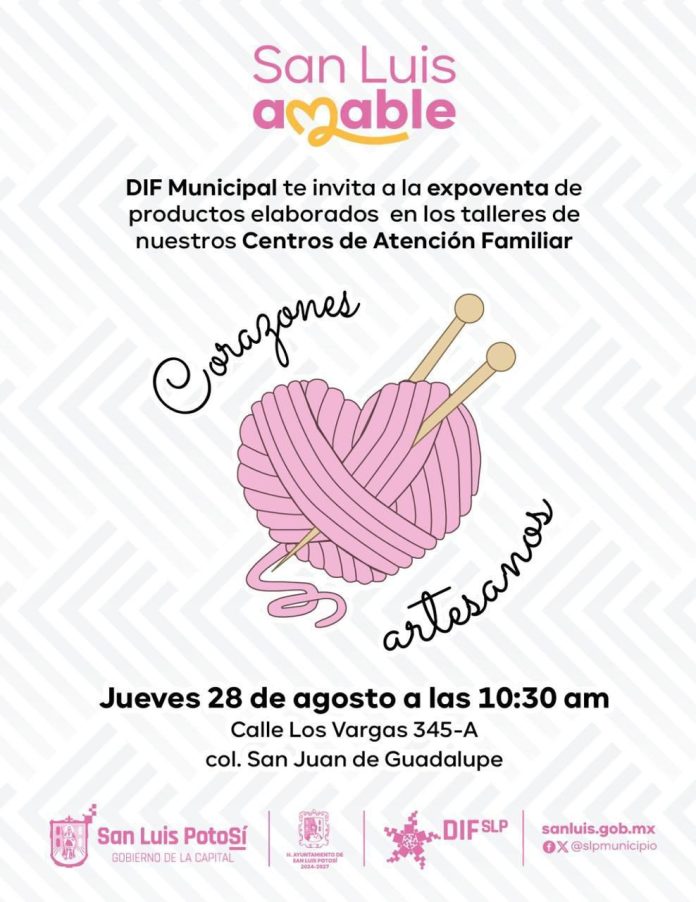 SLP.- El Sistema Municipal DIF, encabezado por su presidenta Estela Arriaga Márquez, continúa con el impulso a la economía familiar, en esta ocasión, a través del 4to. Tianguis “Corazones artesanos”, el cual se llevará a cabo el jueves 28 de agosto en el Centro de Atención Familiar ubicado en calle Los Vargas no. 345-A, col. San Juan de Guadalupe.