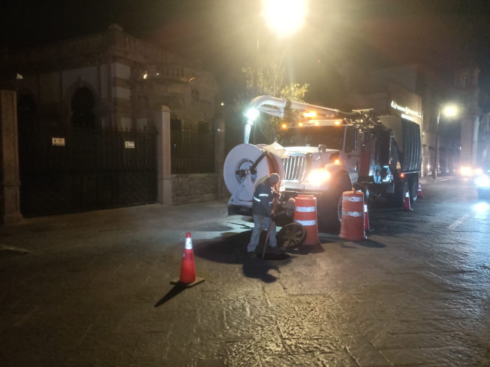 SLP.– Durante las jornadas nocturnas de limpieza en el Centro Histórico por la próxima temporada vacacional, personal de INTERAPAS retiró varios tapones de grasa vegetal de la red sanitaria en la calle Álvaro Obregón.