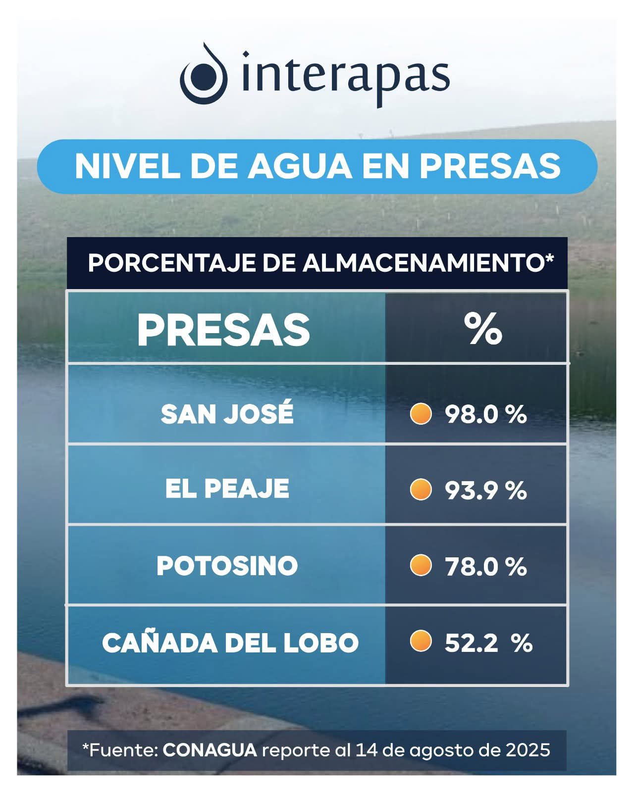 Protección Civil Capitalina dio a conocer, que de acuerdo con el INTERAPAS, el porcentaje de almacenamiento de las presas está de la manera siguiente: San José en un 98 %; El Peaje en un 93.9 %; El Potosino en 78 % y la Cañada del Lobo en un 52.2 por ciento.