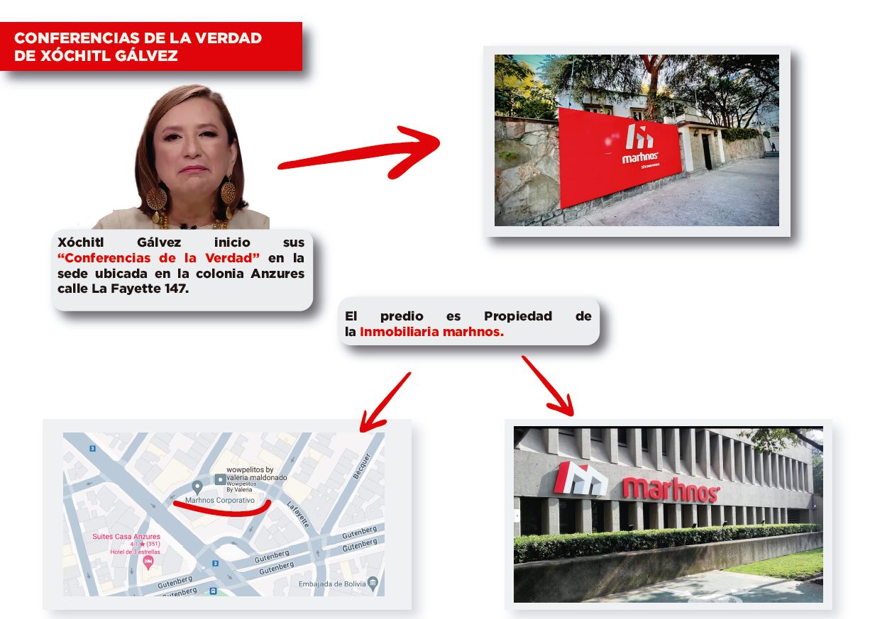 “¿Qué estamos denunciando? Que ella [Gálvez] es socia y parte del grupo Marhnos, porque le da las licencias y contratos: conflicto de interés, tráfico de influencias, corrupción. Es la nueva modalidad del moche. Ya no es la lana literal, ya es ‘te entrego contratos o te hago el favor de pagar tu viaje a España y organizarte la agenda. Y aparte te presto mi casa, te presto mi edificio, y ahí da las conferencias de prensa’. No sabemos qué otros favores y cuánto dinero esta desarrolladora inmobiliaria le está entregando a la campaña de Xóchitl Gálvez para financiar los Xochibots. El dueño, Nicolás Mariscal, acompañó a la candidata en su reciente visita a España; gira que financió y cuya agenda organizó”, acusó.